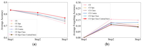As shown in Table 1, satisfied accuracy was obtained for the method which used spatial loss, class loss and contrast loss simultaneously. It was found that using only cross-entropy causes the historical knowledge to be covered by the newly learned knowledge of the model. For this reason, the spatial loss and category loss introduced help the model preserve the knowledge learned from the historical datasets in the third step and alleviate the forgetting of knowledge effectively. In addition, combining the spatial and class losses produced better results in terms of knowledge retention in the latter two steps. This ensures that knowledge is transferred from the historical model to the new step model training. Eventually, contrastive loss is introduced to enhance the representativeness of the acquired features in the continual learning process, which leads to better performance in enabling the model to retain historical knowledge. The above experimental results indicate that our proposed method could lead to a favorable performance on continual scene classification tasks across different datasets.