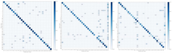 In Figure 7, Figure 8 and Figure 9, we display the confusion matrices for the three-step classification results of our proposed method. Our method accurately recognized most of the scene images. From these figures, we can see that there are fewer misclassified scenes in the AID dataset for the first step. With the added RSI and NWPU datasets, the number of misclassifications in the AID dataset gradually increased. Specifically, all categories obtained comparable accuracy at the first step. The bare land (class 1), beach (class 3), desert (class 9), meadow (class 13), etc. can easily be categorized into another dataset. This is because these similar scenes are shared across these different scene datasets. Similarly, for the RSI dataset, several scenes could still be misclassified into other datasets easily, especially the scene imagery of dam (class 9) and parking lot (class 21). As for the large-scale NWPU dataset, due to the significant inter-class similarity and intra-class variation, the misclassification not only occurred within the dataset, but also across different domain datasets. Nevertheless, comparing the confusion matrix of model classification results at different stages, our method provides favorable results in the continual learning process across different datasets. This demonstrates that our method obtains valuable information quickly from new datasets without compromising the performance of the model on historical data.
