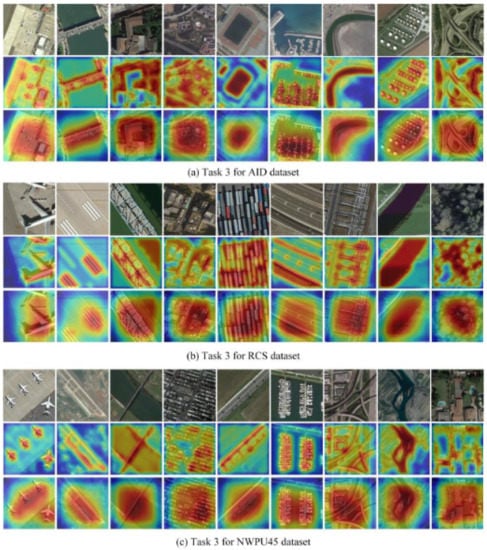 Heat map visualization results of the model on different datasets in the third step. (a–c) represent the results on the AID, RSI, and NWPU datasets, respectively. The first row of each subplot represents the original image, the second row represents the fourth layer attention map of the backbone network, and the third row represents the fully connected layer attention map of the model.