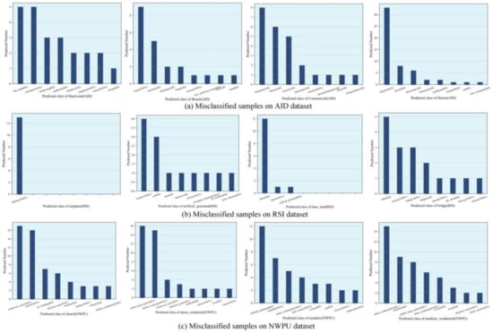 Histograms of misclassified samples among the three datasets. (a) indicates the statistic results of misclassified scenes on the AID dataset; (b) indicates the statistic results of misclassified scenes on the RSI dataset; (c) indicates the statistical results of misclassified scenes on the NWPU dataset.