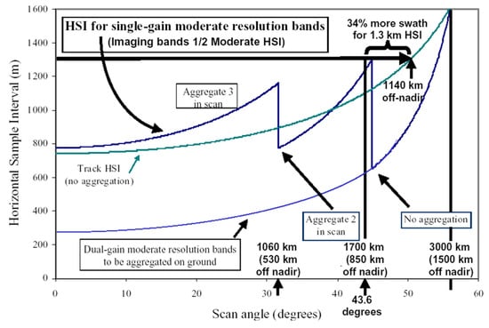 VIIRS horizontal sampling interval (HSI) for a VIIRS moderate band as a function of scan angle. The light blue and green lines show the unaggregated pixel growth along-scan for the scan and track directions, respectively. The dark blue line shows the pixel growth for the scan direction with the three aggregation zones.