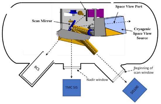 The RSBs’ wide spectral diversity, dynamic range, and detector field of view require a unique source to radiometrically calibrate the sensor. A spherical integration source with a 100 cm diameter (SIS100) that provides a spatially uniform, unpolarized wide field of view target is used to calibrate all the RSBs (excluding bands M1–M3 low gains). A small high-brightness SIS mounted on the three-mirror collimator (TMCSIS) source is used to calibrate bands M1–M3 low gain, since SIS100 cannot cover the top of their dynamic range. Figure 4 shows the layout of the SIS100, TMCSIS, and SV source with respect to the VIIRS sensor in the TVAC chamber.