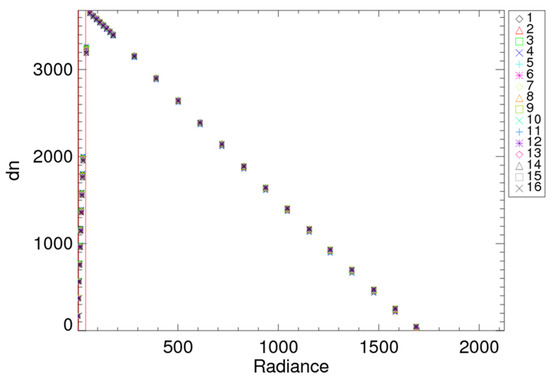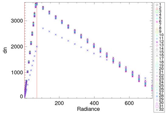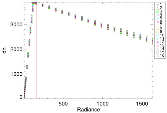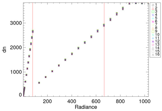 At each temperature plateau and electronics side, the radiometric characterization test utilizes over 40 individual SIS100 lamp levels to allow the characterization of all the bands (excluding M1–M3 LG) through their dynamic range. Each lamp level has three unique VIIRS sensor configurations, fixed high gain, fixed low gain, and auto gain, with each of these configurations taking two measurements of the LAA in and out of the optical path. This allows the band’s high and low gain measurements to be acquired near simultaneously in time and have the response in the on-orbit auto gain configuration to be captured for comparison with its fixed counterparts. These measurements are acquired in an LAA out, in, in, out pattern to reduce the impact of small source drifts during the data collections. The dual gain switching for bands M1–M5 and M7 is also evaluated using the auto gain measurements by looking for SIS100 levels where the band’s response has both gain states within its collection.