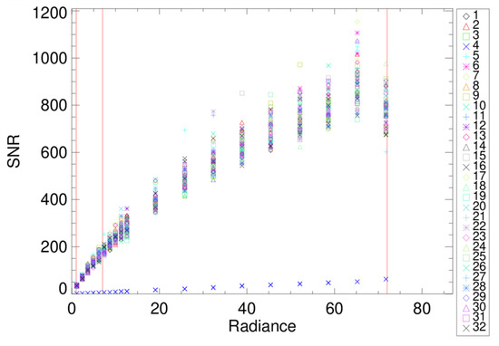 The SNR is computed using the same data as the dynamic range calculation. Equation (8) is the SNR computation for the VIIRS detectors.