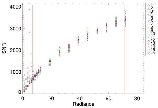 The signal-to-noise ratio (SNR) of band M10 for all detectors (colored symbols) as a function of SIS100 radiance (W/m2/µm/sr). The three vertical red lines are for Lmin (left), Ltyp (middle), and Lmax (right).