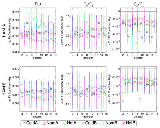 Band M1 high gain fit coefficients for all detectors (x-axis) and TVAC/electronics configurations (colors and symbols). The columns are tau, , and . The rows are HAM A and B. Cold, nominal, and hot plateaus and electronics sides A and B are shown here.