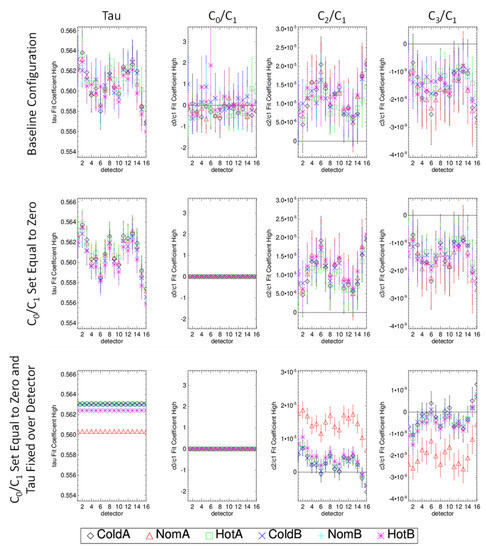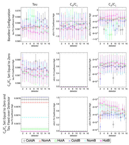 An example of fitting coefficients, for the VNIR bands, is shown in Figure 15 for band M1, HAM A in high gain for all temperature and electronic configurations. The first row shows the fit results with no constraints on the coefficients; the second row fixed to zero; the third fixed tau to the detector, plateau, and electronic side average; and fixed to zero. The first row shows how error contributors due to higher-order nonlinearity, offset biases, source instabilities, and other contributors cause the tau to be detector and configuration dependent, to be less than zero, and to have anticorrelated behavior with the tau term. The second row, where is fixed to zero, has a minimal effect on the tau and terms but is impactful on low radiance Earth scenes, where a small bias can have a significant impact on the estimated top-of-atmosphere SDR radiance. It can even result in nonphysical negative radiance SDR values. The on-orbit calibration coefficients used in the SDR processing set equal to zero to eliminate this effect. The third row, where the tau is fixed to an average of detector and sensor configuration, has a significant effect on the magnitude and detector-to-detector shape of the nonlinear term. Fixing the tau causes the term to be more consistent in both the detector and sensor configurations. Since the tau is expected to be constant across detector and sensor configuration, the values in row 3 are believed to be more representative of the actual detector’s nonlinear behavior. The last row combines the fixed tau across detectors and equal to zero and is the configuration of choice for the VNIR calibration coefficient fit regression.