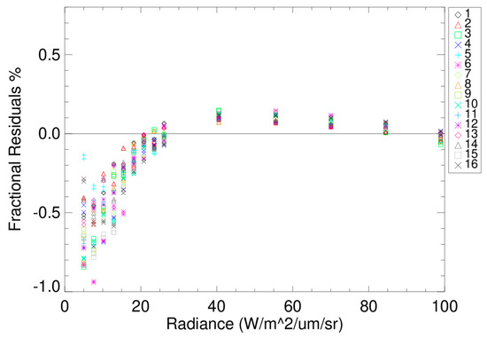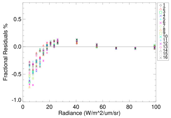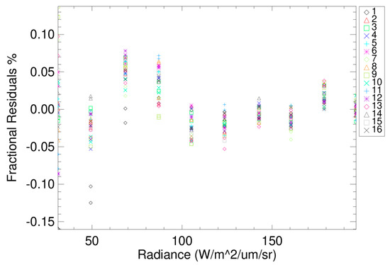 The SWIR band’s response versus SIS100 radiance did not match the VNIR band’s behavior with Figure 16 and Figure 17 comparing the fit residuals of band M7 low gain with band M8 single gain for HAM side A, respectively. The y-axis is the fit residual based on the least squares regression of Equation (6), and the x-axis is the SIS100 radiance. The different color symbols correspond to the different detectors for that band. The band M7 fit residuals, in Figure 16, are on the order of ±0.15%, while the band M8 fit residuals, in Figure 17, are ±0.5% at low radiances. There is also a visible nonlinear residual error at low radiance scenes for the band M8 fit that is not present in the M7 values. An investigation by the vender found that this nonlinearity was a result of an improper voltage bias on the SWIR focal plane. This required the regression fits for the SWIR bands to have a term to account for higher nonlinear behavior. Equation (10) shows how this additional term is added to Equation (6).