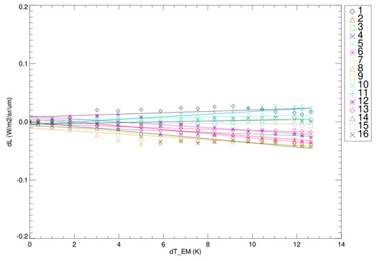 The response change versus EM or focal plane temperature is measured during the transitions between TVAC plateaus. The rate of change in the response versus the delta temperature of either the EM or focal plane change is computed and as a correction to the calibration coefficients. With on-orbit calibration measurements only at the South Pole, intraorbital temperature corrections of the calibration coefficients are required. Figure 20 and Figure 21 show an example of the band M1 response change (δL) as a function of temperature change (δT) for the EM and optomechanical module (OMM), respectively, during the transition between cold and nominal plateaus. Each symbol represents a measurement captured during the plateau transition, and each color corresponds to a detector within band M1. The fit lines in the figures are used to model the temperature sensitivities for requirements assessment and on-orbit look-up table (LUT) creation. The focal plane sensitivity for band M1 is on the order of 0.012 W/m2/sr/µm per 1 K change in temperature. The on-orbit variations within one orbit are on the order of 2 K. This indicates that the impact of the response sensitivity to temperature is around 0.024 W/m2/sr/µm or less within an orbit. The band M1 response sensitivity to the EM is around 0.0007 W/m2/sr/µm over a 1 K range. Orbital EM temperature variation within an orbit is ~0.5 K or less, making the temperature sensitivity of the response to the EM temperature almost negligible. Table 5 lists the temperature sensitivities for all the bands for both the EM and OMM.