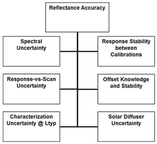 The RSB reflectance uncertainty is broken down into six contributors to the total uncertainty. Figure 22 shows the reflectance accuracy error tree contributors that are root sum squared (RSSed) into the top-level accuracy value. Each one of the boxes in Figure 22 has subcategories that are listed in Table 6 for all the RSBs. The values in Table 6 come from sensor-level testing, subassembly measurements (SD, SDSM), and modeled data (lunar, straylight). The main contributor to the on-orbit reflectance accuracy is the uncertainty in the SD bidirectional reflectance factor (BRF) and the ability of the SDSM to track the change in the BRF. All the bands, excluding band M11, meet the reflectance accuracy uncertainty requirement of 2%. The characterization of the band M11 BRF had higher uncertainty due to limitations of the vendor’s measurement equipment at 2.25 µm. The higher M1 BRF uncertainty is due to the inability of the characterization equipment to directly measure the BRF at that wavelength and, therefore, required extrapolation. More detail on the M11 extrapolation can be found in [18]. The SD BRF characterization is a key component to the instrument’s on-orbit calibration and is performed independently for each instrument build before launch. Differences in the SD BRF characterization methodologies between instruments can cause on-orbit biases in their SDR radiance values. A comparison of the S-NPP and JPSS-1 VIIRS SDR radiances shows a 2–3% difference. An SDR bias study was performed and showed that the S-NPP VIIRS instrument used a different SD BRF prelaunch characterization setup compared with JPSS-1 VIIRS and likely caused the bias between them [19]. The prelaunch characterization of the RVS is very good (less than 0.3%), but the band M1 values in Table 6 include modeled on-orbit degradation that increases the value to 0.71% at the sensor’s end of life. The uncertainty from the calibration coefficients, temperature sensitivity, and response drift between SD calibrations are small contributors to the total uncertainty. This is a testament to the prelaunch calibration test equipment and measurement methodology.