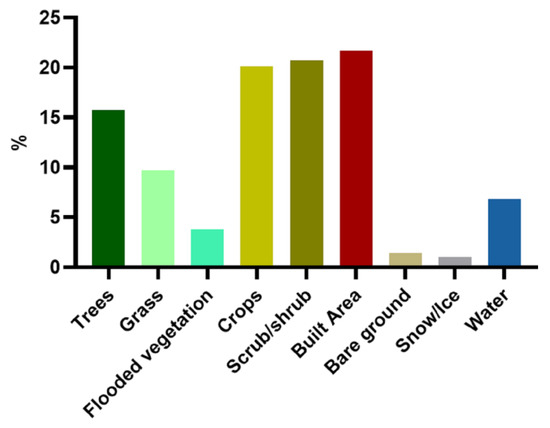 The global land cover dataset, Esri 2020 land cover dataset, was used as the prior knowledge of land cover types, which was derived from 10m Sentinel-2 data by using deep learning methods [35]. The dataset consists of ten land cover types (clouds, trees, water, built area, flooded vegetation, grass, snow/ice, crops, bare ground, and scrub/shrub) with an overall accuracy of 85%. We assumed that the land cover type in 2020 had not changed much from 2019 when the Sentinel-2 images were acquired from a large-scale perspective.