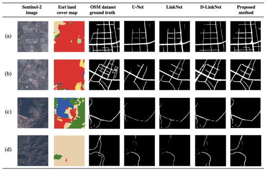 An example of the Road extraction results derived from different road extraction methods. (a,b) are two cases where Built Area is dominant; (c) is a case with very complicated land cover background, while (d) is a case where Scrub/Shrub is dominant.