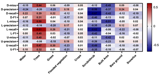 The PCCs between the land cover types and the road extraction performance indexes. D-, L-, and U- indicate the results obtained by D-LinkNet, LinkNet, and U-Net, respectively.
