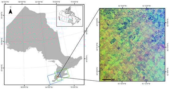 The study area is near London city in southwest Ontario, Canada (Figure 1), with three typical crop types: corn, soybean, and wheat. Other ground cover types include grass, woodland, and build-up. The crop types in each field changed every year due to crop rotation. Generally, corn and soybean are seeded in May and harvested in October. Winter wheat in this study site is planted in October of the previous year and harvested in July of the following year [].