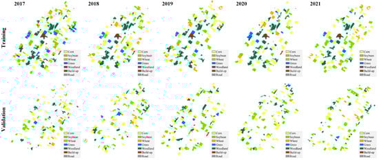 The ground truth of crop types from 2017 to 2021 for model training and validation was collected based on ground survey and visual interpretation, as shown in Figure 2. First, the crop types and the locations of their fields were recorded and converted to vector layers in ArcMap software by drawing polygons using optical satellite images as the base map. Then, for each year, 100 polygons were selected as the training dataset and the other 100 polygons were used as the validation dataset.