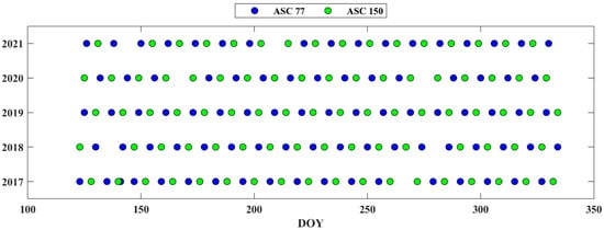 Sentinel-1 data acquisition date. The x-axis is the day of the year (DOY) and the y-axis indicates the years. ASC represents the ascending orbit.