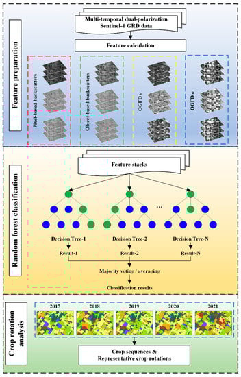 In this paper, a crop classification and rotation mapping scheme combining the random forest (RF) algorithm and new statistical features, named objected generalized gamma distribution (OGΓD) features, extracted from time-series ground range direction (GRD) Sentinel-1 images, is proposed. First, the SAR time-series stacks based on Sentinel-1 data are established, including VH, VV, and VH/VV polarizations. Then, the object-based features for those three channels can be calculated, including backscattering features and the OGΓDs. After comparing the classification performance of these features combined with the RF model, the one that achieves the highest accuracy is selected to output the annual crop map for each year. Finally, annual crop-type maps of five consecutive years (2017–2021) are synthesized as a crop sequence dataset for identifying representative crop rotation patterns.
