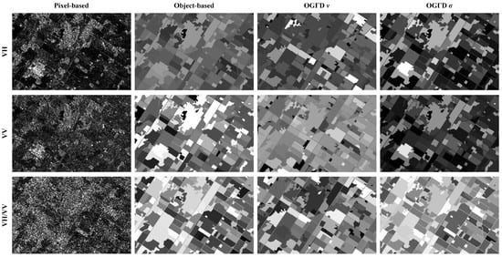 Four types of features were tested in this part, including pixel-based backscatter, object-based backscatter, OGΓD v, and OGΓD σ. Since 2019 has the most complete data of the five years, 36 scenes of SAR images in 2019 were selected for the accuracy evaluation. Examples of the features calculated based on SAR images taken on 4 July 2019 are shown in Figure 5. For each feature type, three polarization channels were included: VH, VV, and VV/VV polarization. After the feature set preparation, all features are inputted into the RF classifier for model training and crop classification. The training and validation datasets are shown in Figure 2. Each year, there are 100 parcels for training and 100 other parcels for validation. Therefore, the number of trees of the RF classifier is set at 100 to ensure the performance of the model.