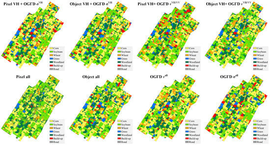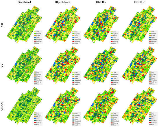 For statistical features, OGΓD v and OGΓD σ were tested. The OGΓD v presented a low accuracy in all three polarization channels, especially for the three main crops in our study area. Nonetheless, another statistical feature, the OGΓD σ, performed best among the four tested features, showing the highest OA of 96.66% and 95.34% of the Kappa in the VH polarization channel. The OGΓD σVV achieved a high precision for the corn and the soybean region, but only achieved 49.80% and 40.76% for wheat and grass, respectively. The OGΓD σVH/VV was not as good at classifying crops as the VH and VV polarizations, while it was better at identifying build-up regions. Combing the visual and quantitative evaluation results, the OGΓD σVH performed best among the four types of features.