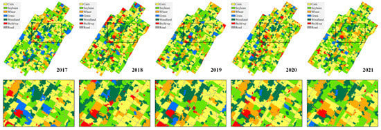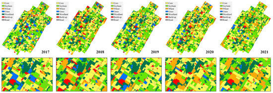 In the previous part, the classification performance of single types of features and feature combinations was tested, showing that the OGΓD σVH achieved the best among them. In this section, the OGΓD σVH was applied in five consecutive years (2017–2021) to obtain the annual crop maps, which are the basics for the crop sequence and crop rotation analysis. Figure 8 shows the crop classification results by combining the RF and the OGΓD σVH. The black rectangle region gives more details than the results of the whole area. Table 3 gives the assessment metrics, including PA and UA for each landcover type and OA and Kappa for each year.