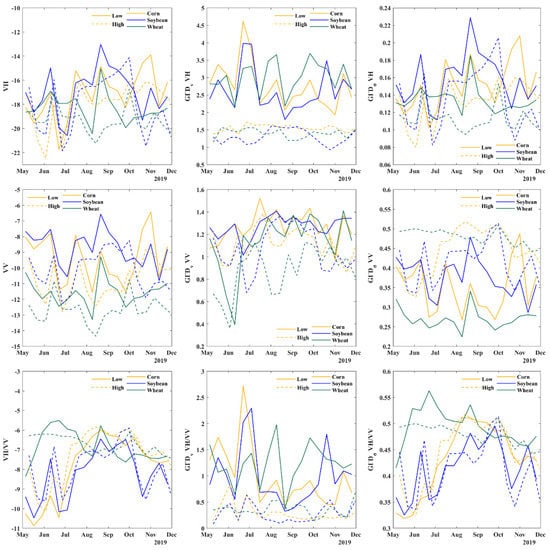 In order to better understand the changes in the features of the crop-growing process, the features involving crop classification are analyzed in this part. The backscatter and OGΓDs in 2019 were selected as in the previous classification evaluation. The temporal variations of these features are shown in Figure 10. The solid line represents a low incidence angle (31.5°), and the dashed line is a high incidence angle (41.5°).