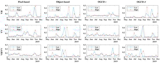 The influence of radar incidence angle was also discussed because there are two Sentinel-1 orbits in our study area. In Figure 10, for the backscatter time series, it can be seen that the backscatter of low-incidence angle images is higher than those of high-incidence angles, especially for the VV polarization. However, the difference between them is uneven, which is not only due to the radar being closer to the target at low incidence angles but also because the backscatter changes with the growing state of the crop. It is worth noting that September to November is a good time window for crop classification due to the maximum difference of backscatter between the three crop types. By contrast, OGΓDs are more sensitive to radar incidence angles, especially for the v in the VH polarization and σ in VV polarization. Therefore, the low incidence angle has a higher value of OGΓD v, while the value of OGΓD σ of the low incidence angle is lower than the high incidence angle.