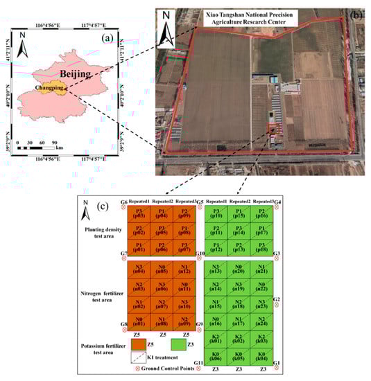 Location and design of experimental area: (a) location of Changping District in Beijing, (b) Xiao Tangshan National Precision Agriculture Research Center, (c) P1, P2, and P3 represent planting density treatments of 60,000, 72,000, and 84,000 plants/hm2, respectively. N0, N1, N2, and N3 represent nitrogen fertilization treatments of 0, 244.65, 489.15, and 733.50 kg/hm2, respectively. K0, K1, and K2 represent potassium fertilization treatments of 0, 970.50, and 1941 kg/hm2, respectively.