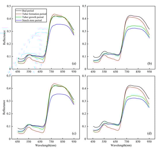 - Extraction of canopy spectral reflectance. According to the ratio method, the digital number value of the hyperspectral image is converted into the surface reflectance based on the black and white panel data collected on the ground. To eliminate the boundary effect, ArcGIS 10.2 software was used to draw the maximum region of interest (a total of 48 plots) for each plot. Based on ENVI 5.3 software, the average spectral reflectance of all pixels in each region of interest was calculated, and the average spectrum obtained served as the spectral reflectance of the potato canopy for each experimental plot [].