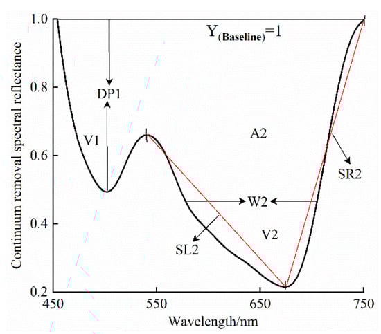 Potato canopy continuous removal spectra. V1 and V2 are two absorption valleys, DP1 is the first absorption depth, W2 is the second absorption width, A2 is the second absorption area, and SL2 and SR2 are the left and right slopes of the second absorption valley, respectively.