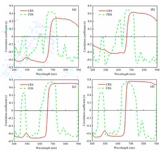Figure 4 shows the correlation coefficient changes of CRS and FDS with AGB at different potato-growth periods. Figure 4a–d shows that the correlation coefficients for CRS, FDS, and AGB in each growth period differ significantly. Overall, the correlation of the two reflection spectra increases from the budding period to the tuber growth period but decreases slightly in the starch-accumulation period. There are also significant differences in the wavelength range where CRS, FDS, and AGB reach a very significant correlation level. At the budding period, CRS correlates significantly with AGB at 454–714 and 742–914 nm, whereas the wavelength range where FDS correlates significantly with AGB is scattered and mainly spread over five ranges: 470–498, 546–602, 702–774, 790–834, and 854–946 nm. During the tuber-formation period, the number of wavelengths in the bands 554–698 and 726–950 nm with a significant correlation between CRS and AGB increases, and the correlation coefficient also increases somewhat. Similarly, the number of wavelength bands (454–506, 542–598, 654–666, 698–950 nm) with significant correlation between FDS and AGB increases, and the correlation coefficient increases. During the tuber-growth period, the correlation between CRS, FDS, and AGB is the highest over all the growth periods, and the wavelength ranges with extremely significant correlations are 454–702, 718–950 nm, and 454–498, 514–534, 546–646, 682–774, and 786–950 nm, respectively. During the starch-accumulation period, the correlation between CRS, FDS and AGB is slightly less than in the previous period. The wavelength ranges that produced an extremely significant correlation were 454–702, 714–950 nm and 454–490, 510–534, 550–666, 678–786, 806–830, and 846–950, respectively.