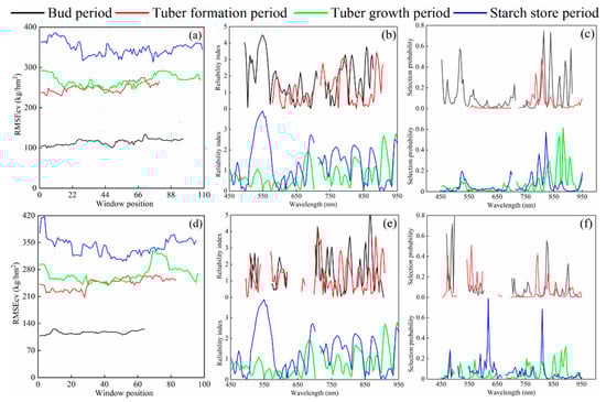 Determination of the influential spectra features in the AGB estimation of potatoes based on the CRS and FDS at the bud period, tuber-formation period, tuber-growth period, starch-storage period. (a,d) Cross-validation RMSEcv statistics using MWPLS based on CRS and FDS, respectively. (b,e) Reliability index statistics using MC-UVE based on CRS and FDS, respectively. (c,f) Selection probability statistics using RF based on CRS and FDS, respectively.