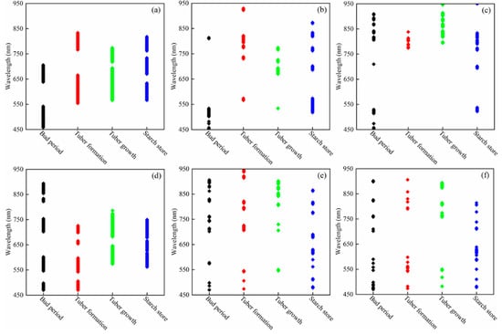 Distribution of wavelengths based on CRS and FDS using three wavelength-screening methods for potatoes for each growth period. (a,d) Characteristic wavelength distribution using MWPLS based on CRS and FDS, respectively. (b,e) Characteristic wavelength distribution using MC-UVE based on CRS and FDS, respectively. (c,f) Characteristic wavelength distribution using RF based on CRS and FDS, respectively.