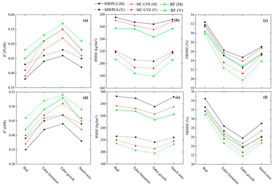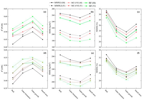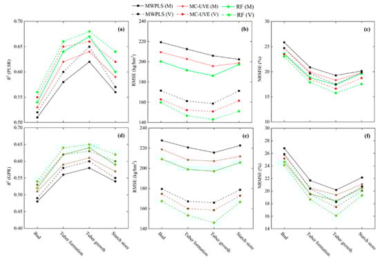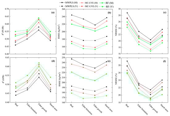 The AGB estimation model was established by RF-PLSR in each growth period, with the highest fitting accuracy and the strongest model stability. From the budding period to the tuber-formation period, based on CRS and FDS modeling, R2 varies over the range 0.45–0.55 and 0.49–0.57, RMSE varies over the range 257.50–243.41 and 252.06–231.75 kg/hm2, and NRMSE varies over the range 30.33–22.77% and 29.69–21.68%, respectively. These results are consistent with the validation results, which show that R2 gradually increases, whereas RMSE and NRMSE gradually decrease. From the tuber-formation period to the starch-accumulation period, based on CRS and FDS modeling, R2 varies over the range 0.55–0.48 and 0.57–0.50, RMSE varies over the range 243.41–256.87 kg/hm2 and 231.75–243.11 kg/hm2, and NRMSE varies over the range 22.77–25.56% and 21.68–24.19%, respectively. It is verified that R2 gradually decreases, whereas RMSE and NRMSE gradually increase.