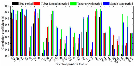 Correlation coefficients of spectral-position features for measured potato AGB at bud period, tuber-formation period, tuber-growth period, and starch-storage period.
