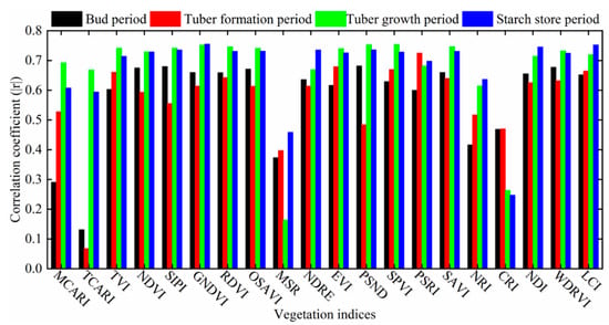 Correlation coefficients of vegetation indexes with measured potato AGB at bud period, tuber-formation period, tuber-growth period, and starch-storage period.