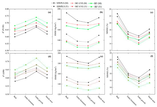 Using the PLSR and GPR methods based on the model parameters listed in Table 3 as independent variables, we obtain the relationship between the spectral location characteristic parameters and AGB in the four potato-growth periods. The indicators (R2, RMSE, and NRMSE) used to evaluate the model accuracy in each growth stage are shown in Figure 10. Based on the evaluation index of the AGB estimation model, the estimation obtained by using the model parameters selected by different methods as variables is consistent with the spectral reflection characteristics, which shows that the variables selected by the RF method produce the best estimates, followed by MC-UVE, whereas the worst estimates are produced by the MWPLS method. Compared with the GPR regression technique, the model constructed by PLSR using the same variables in each growth period produces a larger R2 and smaller RMSE and NRMSE, indicating that the PLSR method improves the accuracy of the AGB estimation model, which is consistent with the results given in Figure 7 and Figure 8.
