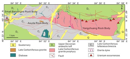 The Baiyanghe deposit is a uranium-beryllium symbiotic deposit in the western Xuemisitan area that has industrial significance and considerable exploration prospects. This area has a complex geological structure, with an extremely developed fault structure and multiple periods of tectonic and magmatic activity [35]. The outcropping deposit strata include Devonian continental volcaniclastic rocks, Carboniferous marine sedimentary detrital rocks with andesitic porphyrite, basic volcanic rocks, intermediate-acid volcanic rocks, and volcaniclastic rocks characterized as marine facies and marine-continental interactive facies. Additionally, the region includes Permian granite porphyry and tuffaceous sandstone [35]. A series of granite porphyry intrusions are distributed in the mining area, including the Yangzhuang rock body, Asuda rock body, and small Baiyanghe rock body. Uranium mineralization was discovered located near the northern rim contact zone of the eastern section of the Yangzhuang rock body (Figure 1).