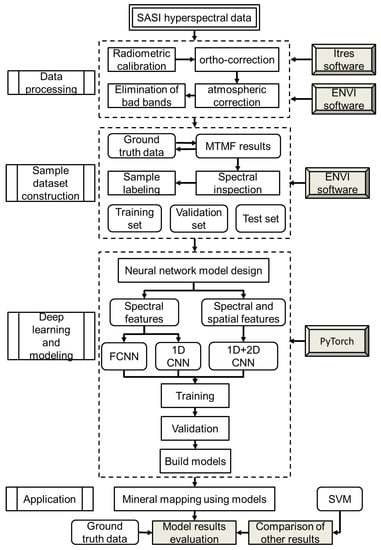 The working process of this research includes airborne hyperspectral data processing, sample dataset construction, deep learning and its applications, as shown in Figure 3. Airborne hyperspectral data processing includes a series of preprocessing processes, where radiometric calibration and ortho-corrections are performed by ITRES software, and atmospheric corrections and elimination of bad bands are performed by ENVI software (version 5.3) developed by Exelis Visual Information Solutions (EVIS), Boulder, CO, USA.