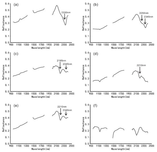 Sample mean spectrum. (a) Spectral curve of calcite. (b) Spectral curve of chlorite. (c) Spectral curve of short-wavelength white mica. (d) Spectral curve of montmorillonite. (e) Spectral curve of medium-wavelength white mica. (f) Spectral curve of the background.
