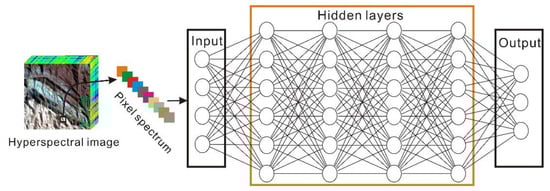 In the field of machine learning, deep learning is currently the most focused technology due to its achievements in speech recognition, visual object recognition, object detection and various other domains [17,18,19]. Deep learning is a method of feature learning through deep neural networks (DNNs). Some scholars have introduced deep learning into hyperspectral image classification, achieving high classification accuracies of more than 90% or even 95% [20,21,22,23,24,25,26]. Although the above studies have demonstrated that deep learning can improve the classification accuracy of ground objects in hyperspectral images, most of the studied objects were stable and uniform artificial ground objects in farmland, woodland or water, which are considerably different from minerals in geological environments.