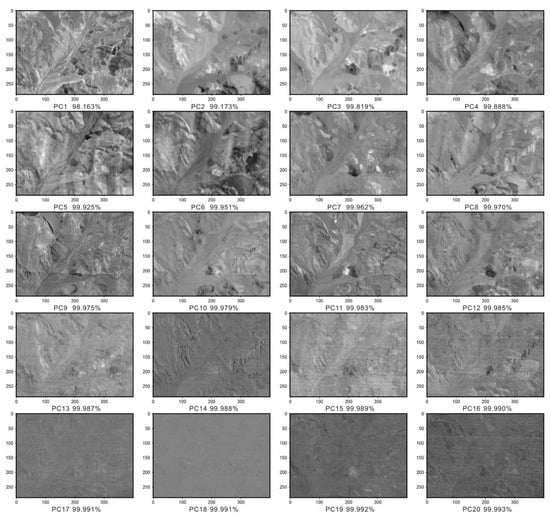 The first 20 principal component images after PCA of the SASI image, the total information content contained in the corresponding principal component and all upper principal components, and the horizontal and vertical axes of the image represent the number of image pixels.