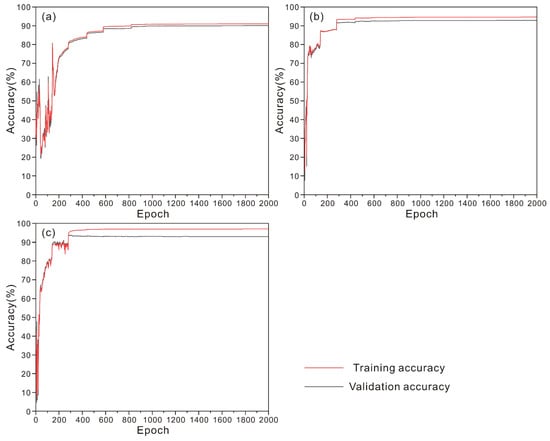 The overall accuracy is defined as the ratio of the number of correctly classified samples to the total number of samples. The producer’s accuracy is defined as the probability that the true reference data of each category are correctly classified, which can be calculated as the number of correctly classified samples divided by the total number of samples in each category. The average accuracy is defined as the average of the producer’s accuracies of all categories, which reduces accuracy deviations caused by unbalanced numbers of samples. The Kappa coefficient is a statistics indicator that measures the consistency between two variables. When the two variables are replaced by the classification results and true values, the Kappa coefficient can be used to evaluate model accuracy. In general, the Kappa coefficient varies between 0 and 1, and the larger the Kappa value is, the higher the classification accuracy. In the training process, with the increase in training epochs, the accuracies of the models on the training set and the validation set were observed to judge whether the model was overfitting. According to the accuracies of the models on the validation set, the hyperparameters can be adjusted to obtain better model performance. In this study, we only adjusted the learning rates of the three DNN models, respectively, and obtained good model performance. As shown in Figure 10, the training and validation accuracies of the three models were all more than 90%. Each network model converged, and the final training and validation accuracies are shown in Table 3. Among the three models, the 1D and 2D CNN had the highest training accuracy and validation accuracy of 97.039% and 93.003%, respectively.