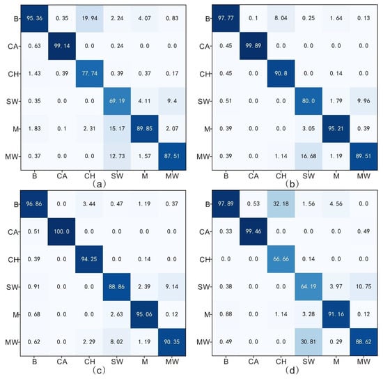 (a) The confusion matrix of the FCNN model for the test set. (b) The confusion matrix of the 1D CNN model for the test set. (c) The confusion matrix of the 1D and 2D CNN model for the test set. (d) The confusion matrix of the SVM method for the test set. CA represents calcite, CH represents chlorite, SW represents short-wavelength white mica, MW represents medium-wavelength white mica, M represents montmorillonite and B represents the background.