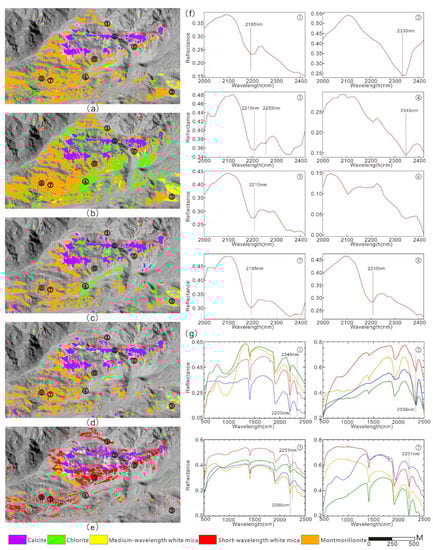 In real geological environments, there is a complex mixture of minerals with similar spectra. In such cases, distinctive absorption features happen very close to or overlap with each other and relevant spectra are highly correlated. This correlation hinders any attempts to identify or discriminate the minerals in routine ways. The discrimination of spectrally similar and intimately mixed minerals and prediction of their abundances in the mixture are long-standing issues in mineral mapping. The polynomial fitting method can effectively track the changes in wavelength positions related to component changes, such as Al-OH and Mg-OH [9,10]. However, this method is mainly applied to composition mapping of specific mineral types. It is obviously more appealing to map various types of minerals simultaneously, including mineral subtypes with similar spectra and different components, in a single remote sensing image.