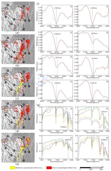 White mica is one of the important altered minerals in the Baiyanghe uranium deposit and has a high correlation with the uranium mineralization discovered in the mining area. Thus, the distinction of various white mica types is of great significance to the study of uranium mineralization alteration [2,30]. The spectral features of short-wavelength white mica and medium-wavelength white mica are similar, and these two minerals also have similar spectral features to montmorillonite. Thus, their mapping accuracies have certain reference significance for model evaluation. To better verify the distinction between the two types of white mica, a section with rich white mica development in the northeastern margin of the Yangzhuang rock body was selected for spectral verification analysis, as shown in Figure 14.