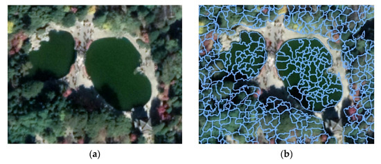 Google Earth images are from different multispectral image sources, and the GE images consist of the three primary colors (red, green, and blue). The GE images used in this study were carefully selected to ensure that each image corresponds to a single image source. Moreover, due to the difference in temperature between seasons, broad-leaved forests exhibit significant defoliation in the autumn and regrowth in the spring [42]. Therefore, five high-resolution GE images recorded in different months of 2018 (31 March, 26 April, 11 June, 23 August, and 31 October) [40,43] were employed for ITS classification to explore the seasonal change features of the tree crowns in the growing and senescence periods of broad-leaved forests [41]. All images were in TIF format and had the Universal Transverse Mercator (UTM) projection with datum WGS-1984. As shown in Figure 2, the spatial resolutions of the GE images were all approximately 0.3 m, including the red, green, and blue channels.