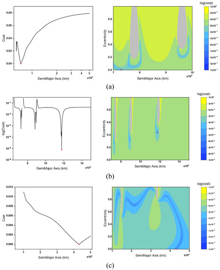 We set a bound on the optimized parameter so that the target will not impact the Earth, seen as Equation (15), and the samples that violate the constraint will be penalized with an infinite value, which is shown as the gray areas of Figure 3. The visualization presentation of the fitness landscape shows that, although there is only one optimum in 1D fitness curves of all three scenarios, multiple minima exist in 2D fitness landscapes and have the depth of the same level, as shown in the dark blue part of the landscape contours.