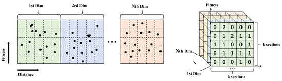 In addition, given the changing fitness landscape in different problems and evolving stages, the adaptive adjustment strategy [26] of F and is utilized in the optimization progress, shown in Equation (9). F and are sampled from Gaussian distribution and Cauchy distribution, respectively. In addition, they are updated by maintaining a historical memory for successful F and , that is, every time the offspring generated by and has better fitness than its paired solution, the and will be recorded into and , respectively, shown in Equation (10):
