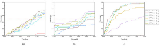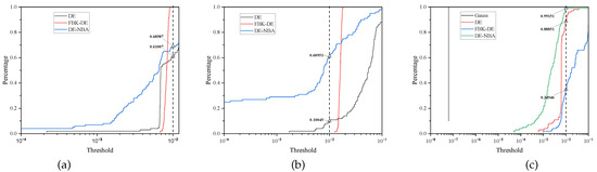 In this experiment, the proposed DE-NBA has run for 50 times to test its performance under different noise levels. Figure 11 shows the variation in the success percentage of IOD in different scenarios. When the threshold is 0.01, if the corresponding success percentage exceeds 0.5, it can be regarded that the algorithm can deal with this level of noise. In detail, in the LEO-LEO scenario, as shown in Figure 11a, the algorithm cannot achieve good results in the noise level of ; in the LEO-MEO scenario, as shown in Figure 11b, the algorithm cannot achieve good results in the noise level of ; in the LEO-GEO scenario, as shown in Figure 11c, the algorithm cannot achieve good result in the noise level of .