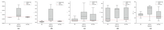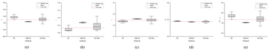 In the LEO-GEO scenario, when the threshold is set to 0.01, the success percentage of Gauss, DE, FBK-DE, DE-NBA are 1, 0.88851, 0.34946, and 0.99151, respectively, which is shown in Figure 7c. Gauss’s method outperforms over all EA-based methods, and its performance is consistent. We depict the orbit element distribution of EA-based methods after 100 runs in Figure 10, and give statistical results of all compared approaches, include the mean, medium, and the best solution in Table 9. It can be seen that the solution of DE-NBA is the best one within the EA-based methods, but Gauss’s method ranks first among all metrics. One promising finding is that the best solution obtained by the DE-NBA is very close to that of Gauss’s method, indicating that the DE-NBA has a similar significant performance as Gauss’s method in the LEO-GEO scenario.